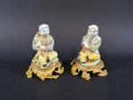 MENNECY. Deux magots en pâte tendre assis tenant une gourde stylisée sur une épaule à...