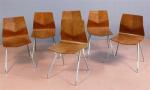 CAILLETTE René-Jean, STEINER éditeur. Suite de six chaises : ''Diamant'' en contreplaqué moulé plaqué d'orme, piétement tubulaire en métal chromé, édition STEINER, vers 1959 (état d'usage, tâches, petits éclats). Inspirée par une feuille de papier plié, René-Jean CAILLETTE, designer des années 50, dessine en 1957 la chaise Diamant pour Steiner