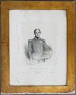 20 - Jérome BONAPARTE (1784-1860) ''Jérome Napoléon Bonaparte, frère de l'Empereur, né à Ajaccio (Corse), le 15 Novembre 1784'' appuyé sur une carte de Westphalie. Lithographie en noir de Cattier. A vue, 50 x 38 (tâche d'humidité)