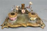 78 - Ecritoire de bureau d'époque Louis XV en bronze à décor rocaille, ornements de fleurettes en porcelaine, terrasse triangulaire avec binet et deux godets faisant encrier et saupoudroir en émaux polychromes à décor floral (accidents et manques, éléments rapportés
