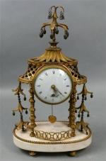 97 - Pendule ''à la pagode'' d'époque Louis XVI en bronze doré en forme de pagode chinoise à toiture à doucine ajourée de croisillons et surmontée d'un dais à pompons, terrasse ovale en marbre blanc. Haut : 40 cm (accident à l'émail)