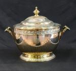 290 - Importante coupe de récompense en argent de style Empire, datée 1904, le corps armorié et à décor de godrons, piédouche à feuilles d'eau, frise de branches de laurier, anses à attaches palmettes, couvercle à doucine godronnée et gravé ''Preis Von Donaueschingen-1904, gegeben von Furst zu Furstenberg''. Travail allemand. Poids : 2.726 g. (sans garantie de métal pour le couvercle (poids sans couvercle 2.044 g)