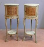 384 - Paire de chevets tambours cannés de style Transition en bois peint et sculpté d'acanthes, piastres, etc..., pieds sabot de biche, ouvrant par une petit vantail, plateau et tablette d'entrejambe en marbre blanc(fentes). Haut. 0,80 m - Diam. : 0,32 m