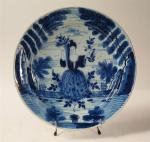14 - DELFT : Plat rond en faience à décor en plein en camaieu bleu d'une femme dans un jardin, ép. XVIII's. Diam : 35,5 cm (égrenures)