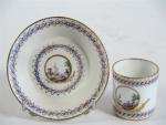 20 - SÈVRES : Tasse litron et sa sous-tasse à décor polychrome au centre dans un médaillon d'une jeune fille avec son chien et sur la sous-tasse d'un jeune homme au bord d'une rive regardant une goélette. Galon de chevrons bleus et roses rehaussés d'or sur le bord. Marqué des deux L entrelacés. Année CC pour 1780. Peintre Vieillard. XVIIIe siècle. Haut. : 5,9 cm. Diam. 12,3 cm.