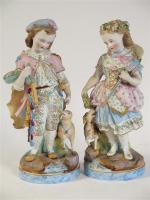 59 - PARIS: Paire de statuettes représentant un couple de jeunes bergers romantiques, la bergère flanquée de sa chèvre et le berger d'un mouton et de sa cornemuse. Décor polychrome mat au naturel. Marquées en creux LM 268 pour les deux. XXe siècle. Haut. : 37,5 cm. (Chapeau réparé et petits accidents).