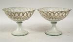 63 - PARIS : Paire de coupes sur pied en porcelaine ajourée à filets verts et dorés, ép. Napoléon III. Haut : 17 cm - Diam : 22 cm (une cassée et reparée). On joint une petite coupe navette sur quatre pieds griffes en porcelaine dorée et ajourée, ép. XIX's. Haut : 7,5 cm - Long : 15 cm (égrenure)