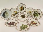 67 - Neuf assiettes à bord contourné, à décor polychrome au centre de fruits, noisettes et pommes. Filets et feuillages or sur le bord. XXe siècle. Diam. : 23 cm.