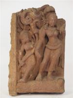 80 - INDE - XIIIe siècle. Bas-relief en grès gris sculpté de deux jeunes femmes debout en léger tribhanga. H. 34 cm.