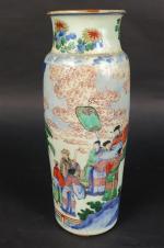CHINE - Vase rouleau en porcelaine blanche décorée en bleu sous couverte et émaux polychromes de taoiste regardant une apparition, XVIII' ème Siècle . H. 37,2 cm.