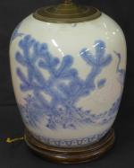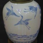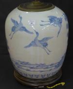 Lampe en porcelaine à décor en camaïeu bleu et en léger relief en "bianco sopra bianco" de grues au dessus des flots et dans un paysage avec arbustes, socle bois. Haut. sans le système d'éclairage : 27 cm
