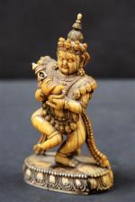 Petite statuette de mahakala debout sur un pied sur le lotus en ivoire à patine jaune, tenant le karttrka et le patra. Tibet 17 eme. H. 8,4 cm.