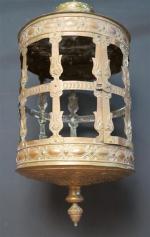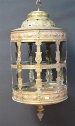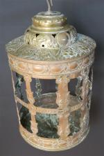 Lanterne cylindrique en laiton repoussé à décor floral, de frises d'entrelacs, etc..., ép. XIX's. Haut : 60 cm (manque un verre)