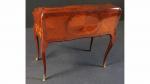 Beau bureau de pente à secrets galbé toutes faces d'époque Louis XV en bois de placage marqueté de branches fleuries dans des encadrements, ouvrant par un abattant à lingotière en laiton, découvrant un intérieur mouvementé et galbé ouvrant par six tiroirs et trois niches à secret, un tiroir en ceinture, pieds cambrés et ceinture à double accolade chanfreinés. Travail parisien d'époque Louis XV. Long. : 0,97 m - Prof. : 0,48 m - Haut. 0,90 m