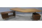 Osvaldo BORSANI (1911-1985) pour TECNO Milano : Bureau de direction Boomerang T96 années 1956 en bois exotique patiné reposant sur un piètement en fonte d'aluminium avec un long caisson pivotant ouvrant par trois tiroirs et un compartiment ouvert et un autre petit caisson pivotant ouvrant par trois tiroirs (plateau insolé). Haut.: 74 cm - Long.: 247 cm - l.: 125 cm