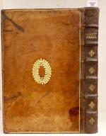 EMILI (Paolo). Pauli Aemylii Veronensis, Historici clariss. de rebus gestis francorum libri X. Lutetiae Parisiorum [Paris], ex Officina Vascosani, 1577 ; in-folio, veau havane, encadrement d'un filet doré sur les plats, avec médaillon floral doré au centre, dos à six nerfs orné de fleurons dorés, [Rel. ancienne]. [4], 244, [21] ff., grandes initiales gravées sur bois. Nouvelle édition comprenant l'intégralité des dix livres de la célèbre chronique composée par l'historien Paul Émile, originaire de Vérone (vers 1455-1529) et devenu historiographe de la cour de France. Elle s'étend depuis Pharamond jusqu'à Charles VIII. La seconde partie annoncée au titre, formant la suite de l'oeuvre de Paul Émile composée par le Bordelais Arnould Ferron, ne se trouve pas dans cet exemplaire bien complet en outre de la table de la première partie. Plusieurs exemplaires signalés au Worldcat sont privés de cette seconde partie. Belle typographie aérée de Michel de Vascosan. De la bibliothèque de Louis Étienne Héricart de Thury (ex-libris du XIXe s. estampillé en rouge au titre et au dernier feuillet). Dos et coins restaurés, épidermures aux plat dont une sévère sur un médaillon, tache brune au titre (annotation lavée), brunissures sporadiques, quelques salissures sans gravité f. 32-33, ensemble frais, bonne condition