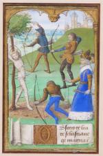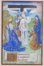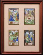 Beau cadre réunissant 4 enluminures sur vélin sous passe-partout. Chacune mesure 69 x 108 mm (à vue) et est peinte dans des dominantes de vert et de bleue, rehaussées à l'or. Descente de croix, Danse macabre, Martyre de Saint Sébastien et Saint Denis portant sa tête coupée. Sur chaque enluminure se trouve un phylactère avec trois lignes de texte manuscrit et une lettrine en bistre rehaussée à l'or. On note de très légères traces de frottements sur certaines enluminures. Bel ensemble