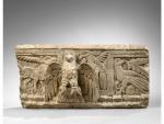 STELE Calcaire sculpté en haut-relief au centre d un aigle aux ailes déployées. De part et d autre sculptés en bas-relief, à droite un oiseau, à gauche un griffon. Copto-Byzantin. Haut 22 cm - Larg. 46 cm.