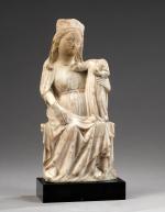 370 - VIERGE A L'ENFANT EN MARBRE (TETE ET AVANT BRAS DE L'ENFANT MANQUENT) (VIERGE CASSEE ET RECOLLEE). Cette sculpture pourrait provenir d'un retable ou d'un devant d'autel.