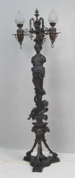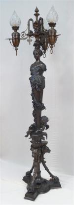 Importante torchère de vestibule à trois lumières en bronze à patine brune figurant une femme drapée à l'antique en buste sur un fut triangulaire orné d'une guirlande de fleurs et soutenu à la base par un amour, piétement tripode à tête de griffons sur pieds griffes, ép. Napoléon III, électrifiée. Haut. : 2,45 m - Larg. : 0,73 m