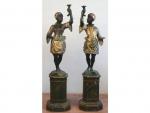 Lot 391 Paire de porte-torchères en bois sculpté polychrome représentant un couple de Nubiens richement vêtus et portant turban, sur socle en bois à pans coupés, travail vénitien du XIX’s. Haut : 1,77 m