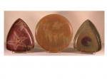 VALLAURIS - MASSIER Clément, 3 plats Clément MASSIER – coupe triangulaire en céramique à couverte irisee à décor d'étoile de mer Clément MASSIER – Plat rond en céramique à couverte irisée à décor d’un rapac survolant des pics, sig é ‘’CM Golfe Juan A.M.’’ Diam 42,5 c Clément MASSIER – Coupe triangulaire en céramique à couverte irisée lustrée à décor de chardons et d’un cercle violine, portant au revers deux étiquettes Clement 36,5 x 31 cm