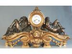 DENIERE : Importante pendule en bronze doré et patiné à deux sujets allégoriques accoudés de part et d autre du cadran et reposant sur une terrasse ornée de coquilles, guirlandes, volutes, etc..., signée sur le cadran "Deniere fabricant de bronzes - Pointaux horloger". Haut : 56 cm Long : 1,03 m.