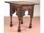 BUGATTI Carlo (1856-1940) : Guéridon en bois naturel et bois teinté incrusté d étain, de laiton et d'os à motifs géométriques et de libellules stylisées, plateau carré gainé de son parchemin d'origine et plaque de cuivre à décor repoussé, large ceinture en arcs surpassés sur pieds colonnes gainés de plaques en cuivre repoussé. Haut : 0,74 m Larg : 0,69 m.