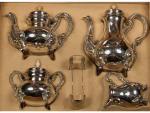 Service à thé et à café en argent, à décor de feuilles d’acanthes et cartouche, sur quatre patins, intérieur vermeil, boutons en ivoire tourné (accident à l’un), avec un plateau ovale et une pince à sucre. Saint-Petersbourg 1895, Orfèvre W. BIRKOWS KI. Poids total 3.760 g, dans un coffret gainé cuir chiffré AO surmonté d’une couronne impériale.