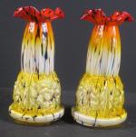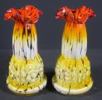 Paire de vases en verre moulé et moucheté jaune, brun et rouge, à décor en relief de fleurs. Haut : 23 cm