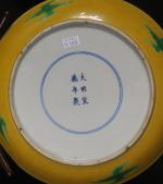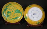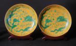 CHINE : Paire de coupes en porcelaine à décor incisé sous couverte et émaillé vert de dragons pourchassant la perle sacrée parmi les nuées. Marque apocryphe de Xuande. XIXe siècle (Restauration) Diam. 25,3 cm. Cabinet Thierry PORTIER Tél 01.48.00.03.41