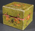 Coffret à parfum en vernis Martin à décor polychrome de fleurs sur fond vert, l'intérieur du couvercle foncé de glace, contenant quatre flacons en verre à pans coupés et bouchons argent, une petite timbale tulipe, un entonoir et un platau à bord polylobé en argent, ép. XVIII's. Haut : 12 cm - Larg : 16 cm - Prof : 14,5 cm (manque au décor du coffret, manque au bord de la timbale)