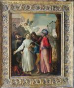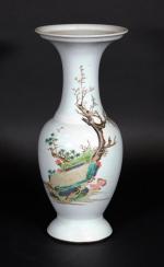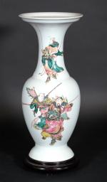 CHINE : Vase balustre à col évasé en porcelaine à décor polychrome de trois guerriers et d'un paysage avec arbustes, ép. fin XIX - déb. XX's. Haut. : 42 cm