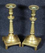 Paire de BOUGEOIRS en bronze, base carrée sur quatre pieds, fût à pans coupés, Espagne époque XVIIe s. Haut : 26 cm.