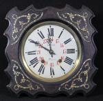 OEIL DE BOEUF d'époque Napoléon III en bois noirci chantourné à incrustations de nacre à décor d'arabesques, le cadran circulaire émaillé blanc à chiffres romains pour les heures et chemin de fer, marqué Rocard Troyes. 41 x 41 x 13 cm. Diamètre du cadran : 23 cm. (usures, piqûres, avec sa clé)