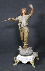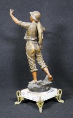 D'après Geo MAXIM - Le Faucheur. Sujet en régule sur un socle en marbre rose veiné noir reposant sur quatre pieds en bronze doré. H. 49 cm sans le socle.
