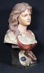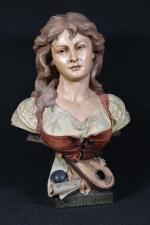Manufacture de L'ISLE D'ADAM, d'après Le GULUCHE et Alphonse HANNE - "Mignon", buste de femme aux instruments de musique. Terre-cuite polychrome, signée et datée 1897. H. 49 cm. (petits chocs)