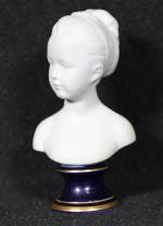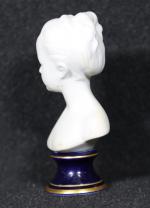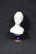 VILLENAUXE, d'après HOUDON - Buste de Louise Brongniart. Biscuit sur une base en porcelaine bleue à filets dorés, signé au dos. H. totale : 15,5 cm.