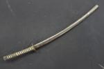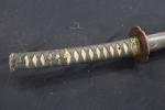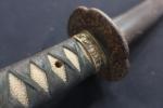 Sabre japonais, dit katana. Poignée recouverte d'un tressage. Tsuba décorée de feuillages. Lame courbe, de 66,3 cm. Fourreau laqué. EM (lame piquée, coups au tranchants, usures)