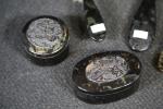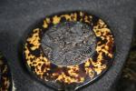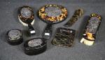 EXTREME-ORIENT - INDOCHINE : Garniture de toilette en écaille à décor repercé en application d'un dragon comprenant un face à main, deux brosses, deux boites, un vide-poche et un chausse-pied (tain du miroir abimé, une brosse accidentée)