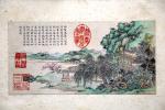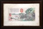 CHINE : Petite peinture d'album à l'encre et couleurs légères sur papier, représentant deux lettrés dans le pavillon d'une demeure nichée parmi les arbres, sur les berges d'un lac bordées de montagnes dans le lointain. Accompagnée d'un long poème sur le thème de l'hirondelle. Avec trois cachets apocryphes Qianlong et Jiaqing. Chine, XVIIIe-début XIXe siècle. (encadrée sous verre). Dim. 13,3 x 26,6 cm. Expert : Cabinet ANSAS-PAPILLON D'ALTON Tél. : 01 45 65 48 19