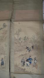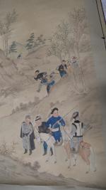 CHINE : Ensemble de quatre peintures verticales à l'encre et couleurs sur papier, représentant des scènes de chasse dans un paysage de montagne. Chine, fin XIXe siècle. (Pliures, cassures). Dim. 85 x 31,5 cm. Expert : Cabinet ANSAS-PAPILLON D'ALTON Tél. : 01 45 65 48 19