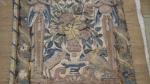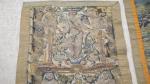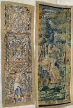 Deux fragments de tapisserie d'époque XVI's - XVII's représentant un couple galant dans un paysage, 183 x 72 ; bordure (?) à décor de personnage sous une treille, oiseaux à la fontaine entre deux cariatides et angelot couronné, 167 x 54 (accidents et réparations)