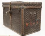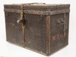 Louis VUITTON, 1 rue Scribe Paris, 149 New Bond Street London, étiquette : Malle rectangulaire en bois gainé de toile damier, N°138853, serrure n°02641, deux lames bois sur le couvercle, intérieur du couvercle capitonné, grand panier sanglé et panier supérieur bois garni de tissu, bordure et sangle en cuir, garnitures en laiton, marqué "M.T de M." (Marie-Thérèse de Mallman (1909-1975)) en rouge et jaune sur les deux côtés. Long. : 0,76 m - Prof. : 0,43 m - Haut. : 0,54 m (état grenier, petits accidents, usures, taches, etc...).