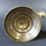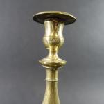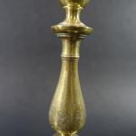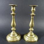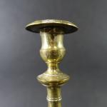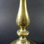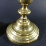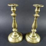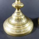 Paire de bougeoirs d'époque XIX's en laiton à décor gravé de fleurs, le fut balustre. Haut : 26 cm (petite déformation à une bobèche)
