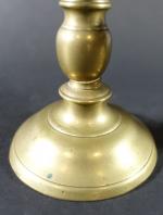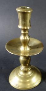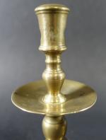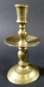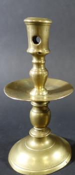 Bougeoir en bronze dit "Heemskerk", fut tourné en balustre avec coupelle intermédiaire, binet repercé, base circulaire, Hollande ép. XVII's. Haut : 19 cm