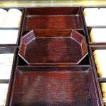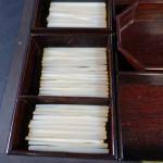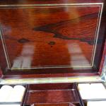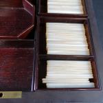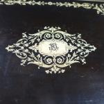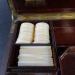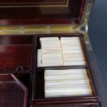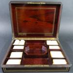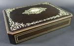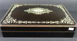 Coffret à jetons d'époque Napoléon III en palissandre à décor incrusté de rinceaux et cartouche en ivoire, l'intérieur compartimenté avec jetons en nacre. Long : 33 cm - Prof : 26 cm - Haut : 6,5 cm
