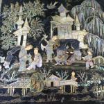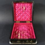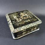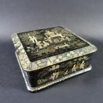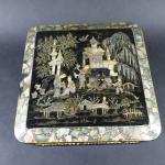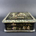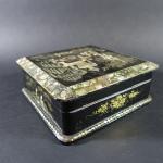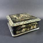 Coffret d'époque Napoléon III à décor burgauté sur fond noir de paysages animés avec pagode. Haut : 9 cm - Larg : 21 x 21 cm (quelques manques à la nacre)