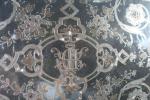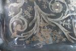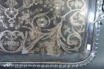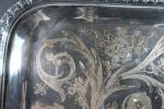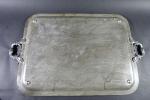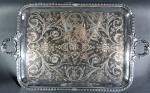 Plateau de service en métal doublé argent à riche décor gravé de rinceaux et fleurs, chiffré au centre, bord à moulure de culots, anses feuillagées, ép. XIX's. Long. aux anses : 81 cm - Larg : 50 cm