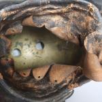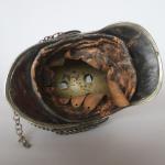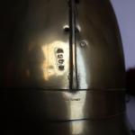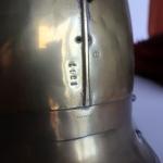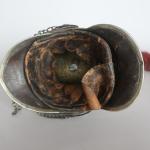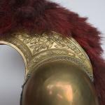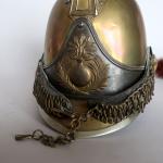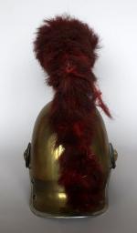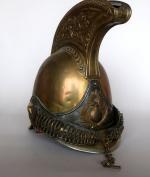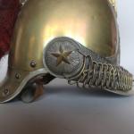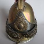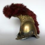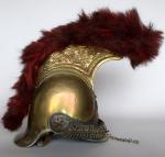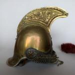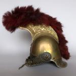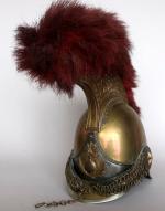 Casque de carabinier époque Second-Empire, modèle 1858 (daté 1867) et poinçonné de DELACHAUSSEE, la bombe à cimier à décor de feuilles de laurier, paire de jugulaires à gourmettes et cuir sur rosaces argentées étoilées, bandeau en fer frappé de la grenade en laiton, chenille en crin rouge (usée), la coiffe intérieure en cuir, estampille de Delachaussée sur la nuquière (usures).